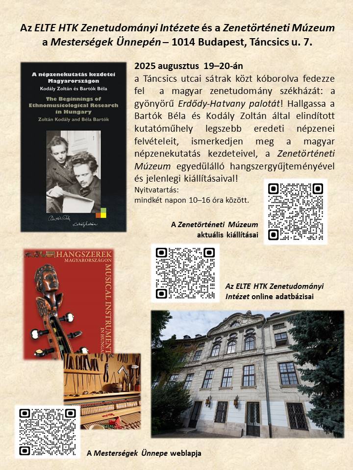 Az idén az ELTE HTK Zenetudományi Intézetet is üdvözölhetjük partnereink között a Mesterségek Ünnepén. A Táncsics utca 7. szám alatt található Zenetörténeti Múzeum augusztus 19-én és 20-án 10–16 óra között tart nyitva, augusztus 20-án ingyenes belépési lehetőséggel. Az épület udvarába lépve, azon túl, hogy a látogatók megcsodálhatják a csodálatos ornamentikát, az intézmény népzenei archívumának hangfelvételeit hallgathatják meg, valamint megnézhetik „A népzenekutatás kezdetei Magyarországon” c. kiállítást.